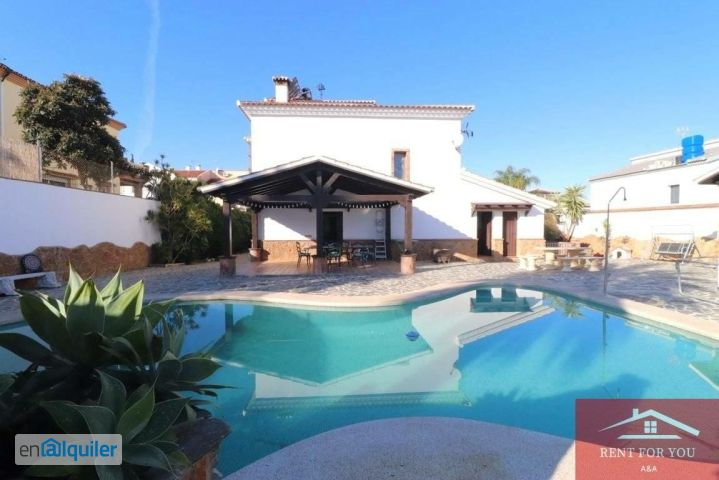 Lujoso chalet en urbanización a escasos 2 minutos en coche de la población, perfectamente comunicada por carretera hacia la capital malagueña, que se encuentra a tan sólo 20 minutos El chalet de unos 500 metros construidos se situa en parcela vallada de unos 800 metros, cuenta con portón de entrada automático, porche trasero cubierto, piscina con jacuzzi, barbacoa techada, zonas ajardinadas, y cuarto de baño con plato de ducha, todo en perfecto estado. La vivienda está construida en 2 plantas más planta sótano. Se alquila con todo el mobiliario que aparece en las fotos, todo de primeras marcas y de alta calidad, cuenta con aire acondicionado por conductos en la 1ª planta. Distribuida en planta sótano en una gran cochera para varios vehículos, con amplio trastero. En planta principal un amplísimo salón con chimenea, cocina independiente, 2 habitaciones y 2 cuartos de baño. En 1ª planta 3 habitaciones más (una de ellas de gran amplitud) en suite y 2 cuartos de baño. El MANTENIMIENTO de la piscina y el jardín están INCLUIDOS EN EL precio. Fianza de 2 meses.