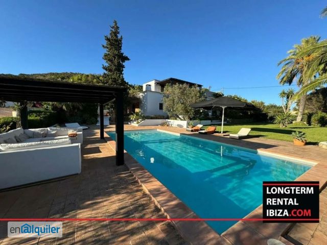 YEARLY RENTAL - SANT JOSEP. Beautiful seven bedrooms villa distributed in a separate flat, a wooden casita and the main house. With a very good location, the fenced villa offers security, privacy and plenty of chill out areas to unwind and relax. Entering the main house you will find a large cosy living room with comfortable sofas to rest after a hard day. To the left we have a dining room with a table for eight people and a sofa area by the fireplace. Further to the left is the fully equipped open plan kitchen with a dinig area tht seats up to six people. From the living room and the kitchen you can access the front porch and the back porch of the villa. To the right of the living room is the staircase leading to the upper floor, a bathroom and two double bedrooms en suite, one of them with access to a small private porch. Upstairs we have the master bedroom en-suite with private terrace with seaview and office area perfect for those who usually work from home, and a second bedroom ensuit with balcony. The pool area is equipped with sun loungers, parasol and a porch where you can relax and enjoy with friends. Also the barbecue area is covered and has a table for up to 24 people, the villa is surrounded by a large and beautiful garden with several porches where you can spend a nice afternoon with your family. The villa also has a two bedroom ensuite flat with a porch and a small kitchenette, which could be used for guests or family, and a complete wooden studio which could be used by guests or staff. Shedule a viewing!