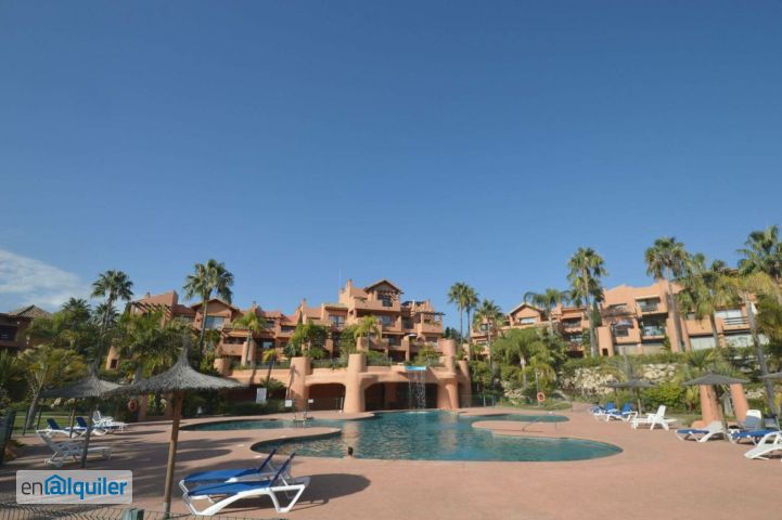 LARGA TEMPORADA¡ IMPRECINDIBLE SOLVENCIA ECONOMICA DEMOSTRABLE! Magnifica vivienda en la Nueva Milla de Oro, a menos de 10 minutos de Puerto Banús y Estepona. Es brillante y se beneficia de dos maravillosa terrazas soleadas con orientación este, sol de la mañana. Calidades de primera y recientemente amueblada con mucho gusto, el apartamento se compone de dos amplios dormitorios, cocina totalmente equipada con electrodomésticos de alta gama, dos baños completos, uno de ellos en suite. Una de las terrazas es muy amplia, para disfrutar todos los días del año. La urbanización no solo cuenta con esta increíble vivienda si no que ofrece espectaculares jardines, zonas de spa y gimnasio totalmente equipado, amplias piscinas comunitarias y seguridad 24 horas. En definitiva una vivienda a la alcance de todos pero con un toque moderno, nuevo y lujoso.