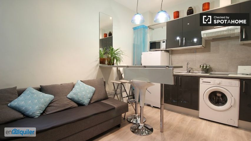 Un acogedor apartamento de 1 dormitorio está disponible para alquilar cerca del metro en el centro de Lavapiés. El apartamento tiene una amplia sala de estar, donde podrá relajarse en el acogedor sofá y ver la televisión, o sentarse a disfrutar de una deliciosa comida en la fresca mesa del bar. La cocina, que está abierta a la sala de estar, tiene todos los elementos básicos, incluido un microondas, una estufa eléctrica de 2 quemadores y una lavadora. La habitación es encantadora, y está bien amueblada con una gran cama doble y mucho espacio de almacenamiento para todas sus cosas. En el baño, encontrarás una ducha considerable y un mosaico precioso. Vivirás en Lavapiés, uno de los barrios más céntricos, bien conectados y multiculturales de Madrid. Lo tendrá todo por aquí, Lavapiés está lleno de restaurantes, cafeterías, bares y tiendas para disfrutar. Y, con 2 estaciones de metro cercanas, ¡nunca estarás lejos de cualquier cosa en Madrid!