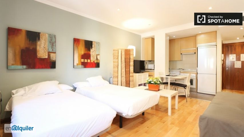 Este estudio bellamente reformado en la calle Valderribas, en el Retiro, tiene una superficie de 50 m² y viene equipado con calefacción y aire acondicionado. La habitación principal está amueblada con 2 camas individuales, sofá y televisión, y también hay 1 baño moderno y 1 cocina esquinera con todo lo necesario para cocinar. El piso está situado a solo 6 minutos del metro y a poca distancia a pie del parque del Retiro. Hay un centro comercial con un gran supermercado y un cine a 15 minutos andando, y encontrarás otras tiendas más pequeñas, bancos y restaurantes muy cerca.