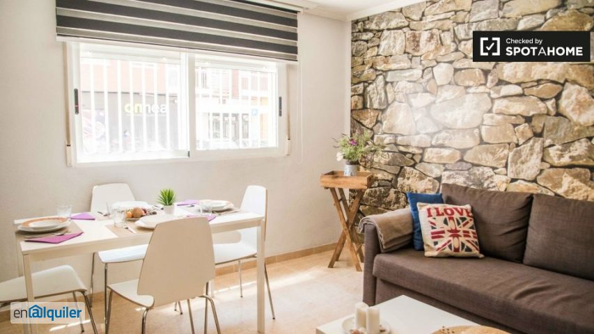 Las habitaciones soleadas están disponibles para alquilar en un piso cerca de la playa en Poblats Marítims. El apartamento tiene una encantadora sala de estar con una bonita pared de ladrillo visto, donde podrá relajarse en el sofá acogedor después de un largo día explorando la ciudad. La cocina tiene todo lo que necesitas para cocinar una tormenta con tus nuevos compañeros de piso, incluyendo un horno y un microondas. Ambas habitaciones tienen mucha luz natural, y cada una está bien amueblada con una cama cómoda y mucho espacio de almacenamiento para todas sus cosas. En el baño, encontrarás una ducha considerable y un agradable mosaico verde. Vivirás en Poblats Marítims, el barrio costero tranquilo de Valencia. El apartamento se encuentra a 2 minutos a pie de la playa, donde puede pasar el día paseando bajo el sol de Valencia. ¡no te olvides de traer tu toalla y un bloqueador solar!